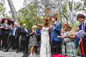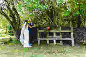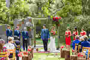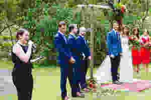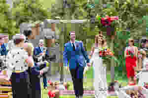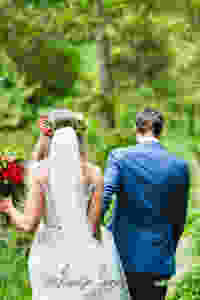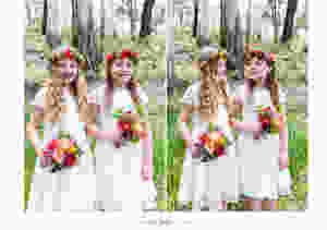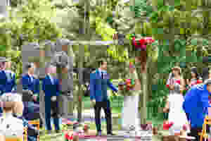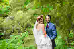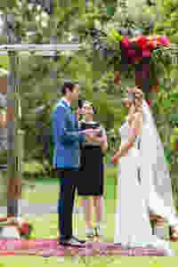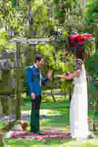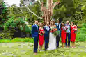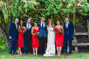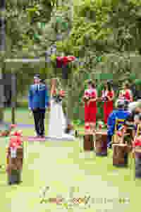 I whisked the bridal party off down the road down an exquisite little path into the rain forest with a magical little orchard surprise. Plenty of Moët was sipped and many laughs were had. The bridesmaids were looking gorgeous in red and the groomsmen very fine in their blue suits. Amanda and Al were perfectly matching; Amanda looking divine in her Marianna Hardwick dress and Al handsome indeed in his tailor made suit.