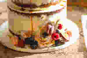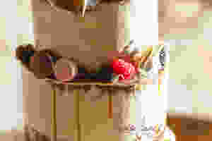 The reception kicked off with the guests relaxing in the lovely courtyard at Shadowfax. Check out the cake! Hullo! How scrumptious!